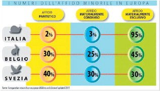 Nel primo e più progredito abbiamo rilevato un grande movimento. In Svezia, infatti, l'affido alternato raggiunge ormai il 40%dei casi di divorzio e le continue ricerche dimostrano grandi benefici come illustrato da Malin Bergstrom del Karolinska Institute, tra cui una scarsa percentuale di minori che perdono contatto con uno dei genitori (13%). In questo contesto di equità genitoriale (e non solo, visto che non è previsto un assegno per l'ex coniuge ma solo per il mantenimento della prole) la conflittualità continua a crollare e ormai, secondo gli ultimi dati, solo il 2% delle coppie affronta un percorso giudiziale. Nell'esperienza del Comune di Malmoe le coppie che si rivolgono al sistema municipale di mediazione con successo, sono il 67-70%, quelle che vi vengono inviate in forma coatta dal giudice trovano invece un accordo in poco meno del 50%. Anche in Belgio la diffusione massiva dell'affido paritetico ha raggiunto notevoli valori (circa il 30%) e malgrado ciò sono ancora allo studio nuovi provvedimenti legislativi per diffondere ulteriormente questa modalità di affidamento. Il “ Nest Modell” (i figli stazionano nella casa e i genitori vi si alternano) rappresenta una piccola parte di tutte le sistemazioni post separative (meno del 3%). Grossi risultati sono anche stati riportati negli ultimi anni dalla Danimarca: attualmente il 23% dei minori figli di separati vive secondo lo schema 7 giorni col papà e 7 con la mamma. Il 4% secondo lo schema 8/6, il 21% secondo quello 9-5 e solo il 12% dei minori perde contatto con l'altro genitore (in Italia è il 30%). La tendenza è comunque verso un deciso aumento. In procinto di salire sul primo vagone anche la Spagna: ormai in Catalogna, Aragona, Baleari e Comunità valenciana l'affido materialmente condiviso (nella maggior parte dei casi alternato, negli altri dai 10 pernottamenti in su) ha ampiamente superato il 30% e punta decisamente verso il 40. Inoltre prossimamente si aggancerà a queste regioni quella dei Paesi Baschi che ha promulgato nel 2014 una legge che dà priorità all'affido materialmente condiviso. La media nazionale di affido materialmente condiviso (custodia compartida) è del 21% perchè esistono nelle regioni meno sviluppate aree legate a vecchi stereotipi.