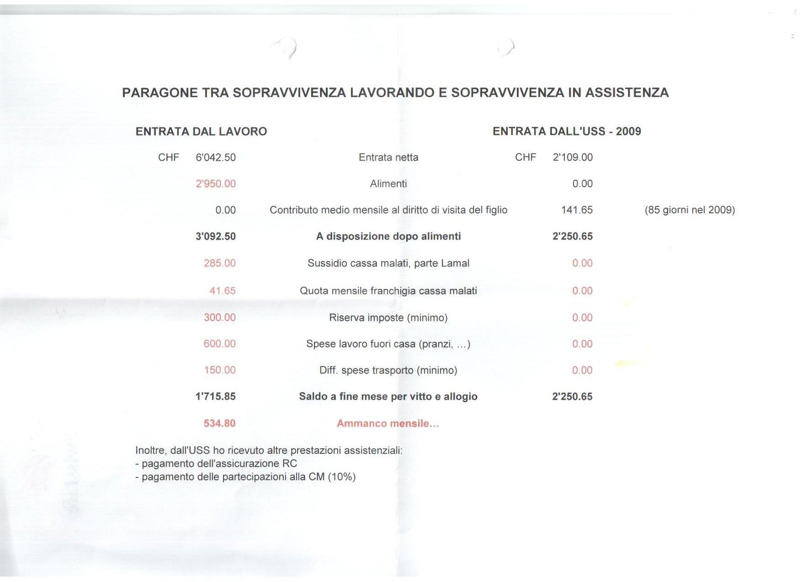 tra la situazione di sopravvivenza al minimo vitale di questo padre divorziato 49enne quando lavorava ed ora che è, suo malgrado, in assistenza. Paradossalmente, egli dispone di maggiori entrate (circa 550 fr mensili in più oltre ai costi per la salute presi a carico dall'assistenza statale) ora che è finito suo malgrado in assistenza e vive meno peggio di quando lavorava...